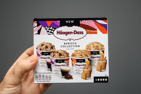 Paris, France - Apr 6, 2019: Man hand holding against gray background package of Haagen-Dazs Barista Collection ice cream with diffrent tastes and new collection