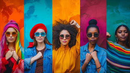 A vibrant and diverse group of five women, each showing unique hairstyles, bold fashion choices, and colorful glasses. The image represents diversity in beauty, race, and style, featuring strong expressions and a harmonious gradient background. Perfect for themes of inclusion, fashion, eyewear, and multicultural beauty