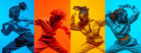 A diverse group of teenagers standing against a vibrant, multicolored background, expressing unity and youth. Perfect for concepts related to friendship, diversity, and modern fashion.