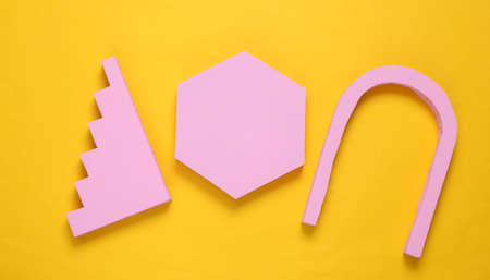 Layout composition of pink geometric shapes on yellow background. flat lay