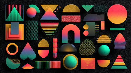 Vibrant arrangement of colorful geometric shapes in various styles creates an engaging visual experience. Ideal for design, art, and creative projects.