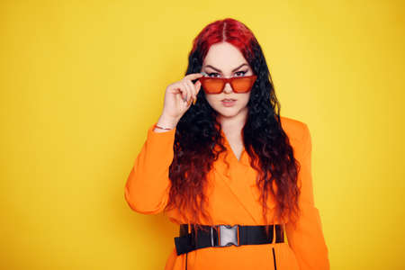 Beautiful girl on a yellow background. A brunette in an orange dress and long hair is posing, smiling, having fun. Woman in sunglasses. Joy and emotion. Red hair roots place for text