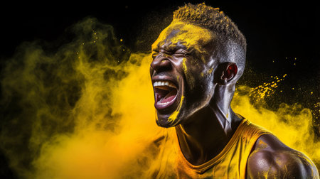 Young man jumping with colorful powder exploding behind him