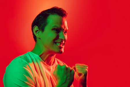 Winner. Caucasian mans portrait isolated on red studio background in multicolored neon light. Beautiful male model. Concept of human emotions, facial expression, sales, ad, fashion. Copyspace.