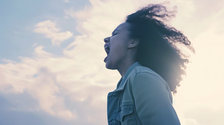 This powerful image captures an exhausted girl with closed eyes, a symbol of burnout, as she screams in anger