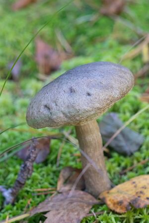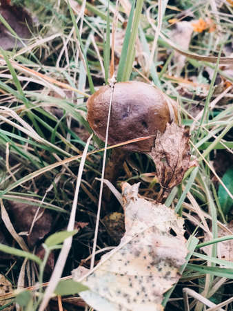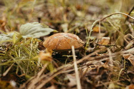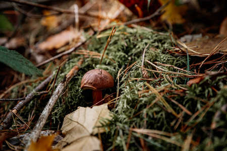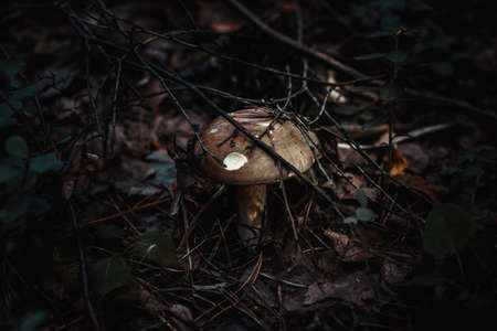 Brown mushroom grows in the forest in autumn.