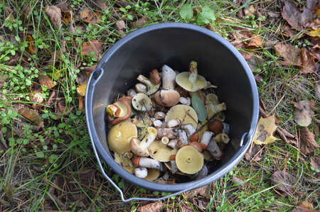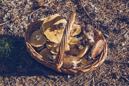 Basket with mushrooms is in a pine forest, late autumn, edible food gourmet