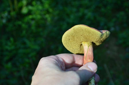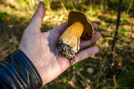 fresh edible mushroom in hand in the forest