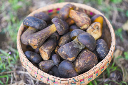 The Cep, Bolete Mushroom on basket, Fresh raw wild mushroom organic food in a forest autumn - cep, black penny bun, porcino or king boletus, usually called black porcini mushroom