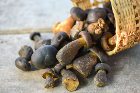 Fresh raw wild mushroom organic food in a forest autumn - cep, black penny bun, porcino or king boletus, usually called black porcini mushroom, The Cep, Bolete Mushroom on basket