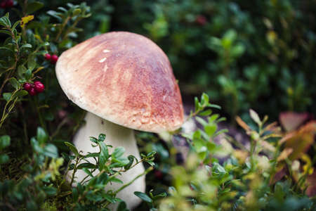 Wild raw boletus mushroom in Latvian forest
