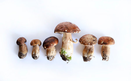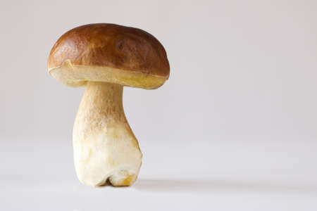 close up of boletus edulis just picked from the woods standing on white background, copy space
