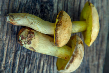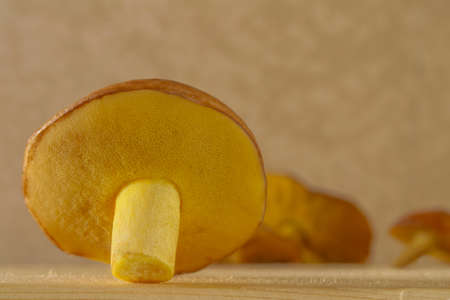 The Yellow boletus mushroom is lying on a light Board. Macro photography of a mushroom