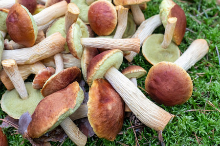 Edible mushrooms Golden boletus Aureoboletus projectellus. A lots of cut mushrooms with red cap and long stalk lie on green moss in forest. Gathering mushrooms in forest, harvest