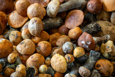 Variety assortment of different forrest mushrooms picking hunting in Sweden, Norrbotten County, Kiruna municipality, with birch mushroom, boletus mushroom, orange-cap boletus and others