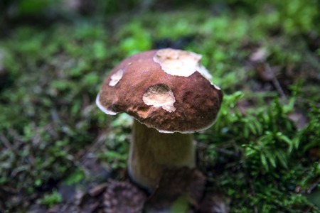 Wild boletus mushroom growing in moss in forest in Latvia. Mushroom hunting seson. Autumn macro shot of white mushroom.