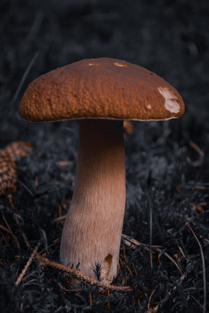 Artistic macro shot of a mushroom growing on the forest floor, dark moody tones.