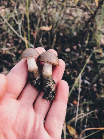Woodland harvest in autumn. Hand holding small Porcini mushroom. Closeness to the nature. hiking and mushroom picking.