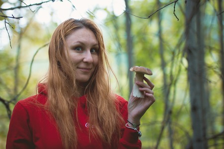 Young woman shows mushrooms boletus in the forest, telephoto