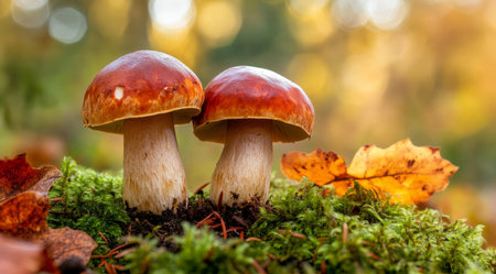 In a serene autumn setting, two mushrooms are surrounded by vibrant and colorful leaves, creating a calm scene
