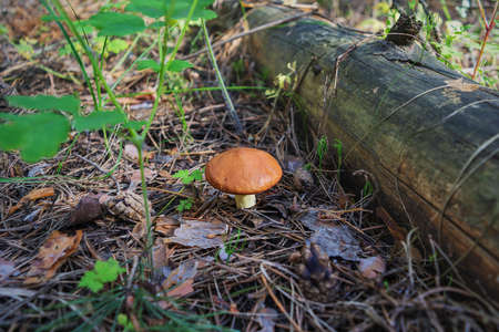 Small edible cep mushroom grows in wood. Cep mushrooms food. Boletus growing in wild nature