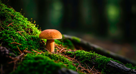 Porcini mushroom in forest moss. Beautiful autumn season nature. Edible mushrooms raw food. Vegetarian natural meal