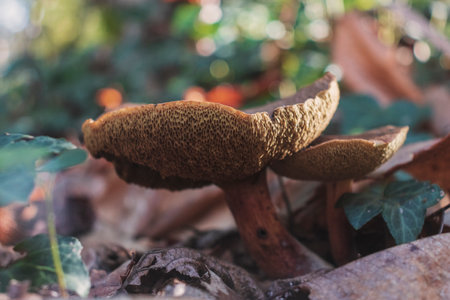 A close-up of a mushroom growing in a forest, capturing its earthy texture and the surrounding natural elements like leaves and soil. -