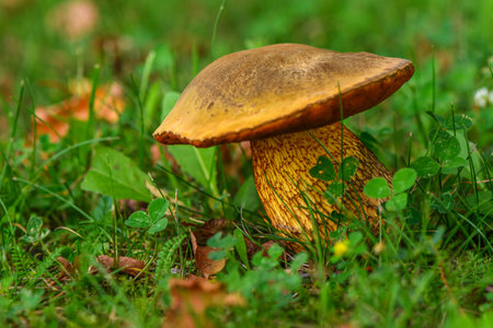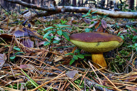 A flywheel mushroom growing in the forest. Mushroom picking. forest mushrooms.