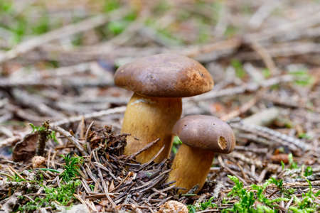 Small edible porcini mushroom grow in wood. Royal cep mushrooms food. Boletus growing in wild nature