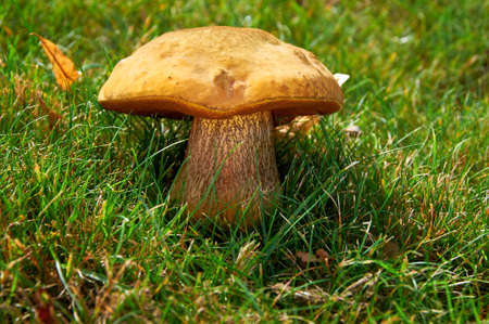 A large boletus mushroom lies on the grass during the mushroom picking season in the forest