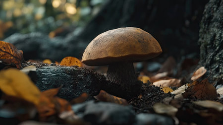 Mushroom growing in an autumn forest surrounded by fallen leaves. Concept of nature, fungi, autumn season, woodland, porcini mushroom. Copy space.