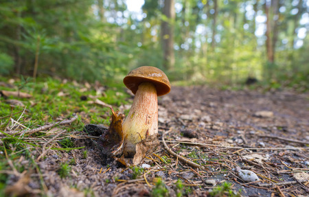 Small edible cep mushroom grows in wood. Cep mushrooms food. Boletus growing in wild nature