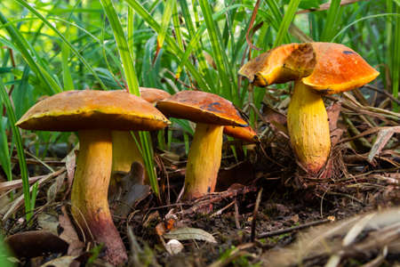 Two boletus edulis mushrooms in forest. Orange cap mushrooms in forest