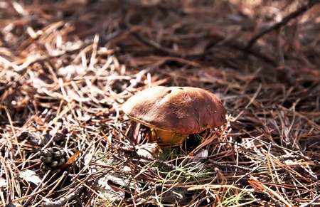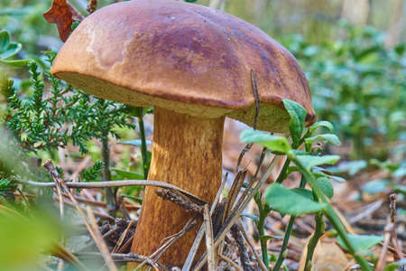 The brown boletus has just come out of the ground. A gnawed mushroom hat. Boletus on a blurred background of green leaves and pine needles.