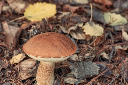 Brown cap boletus in autumn leaves at forest. Birch bolete mushroom in wildlife. Porcini Cep mushrooming. Mushrooms season concept.