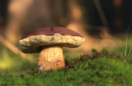 Mushroom Boletus edulis, edible mushroom boletus close up on the forest background. Mushrooming in the forest, mushroom hunting or picking.