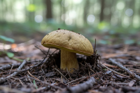 A close-up of a mushroom growing in a forest, capturing its earthy texture and the surrounding natural elements like leaves and soil. -