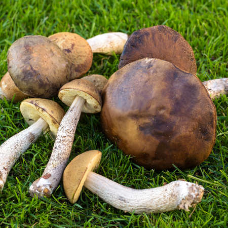Edible mushrooms in a forest on green background. Boletus edulis. Autumn Cep Mushrooms.
