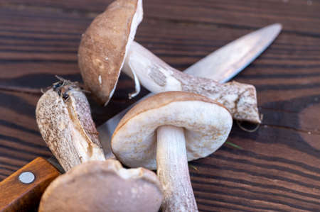 Cut young boletus mushrooms and a knife with a wooden handle on a wooden background, close-up, selective focus. Autumn harvest, gifts of nature