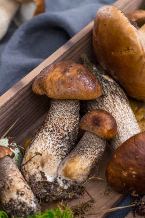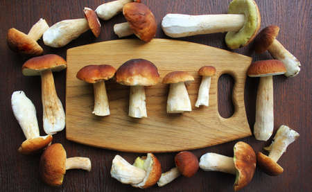 Forest boletus mushrooms on rustic wooden background and a wooden cutting board .