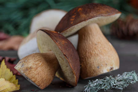 Autumn Cep Mushrooms. Ceps Boletus edulis over Wooden Dark Background, close up on wood rustic table. Cooking delicious organic mushroom. Gourmet food