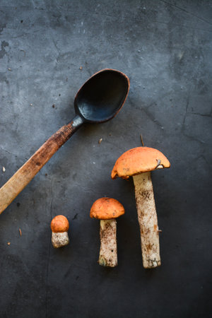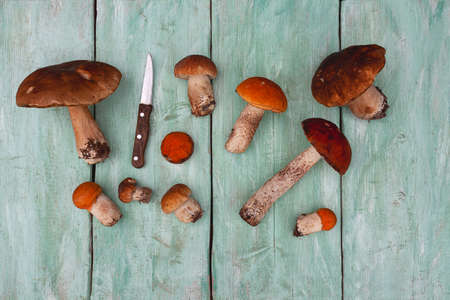 Mushroom Boletus over wooden background.Concept of cooking delicious organic,gourmet food.Flat lay,horizontal.