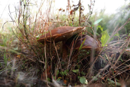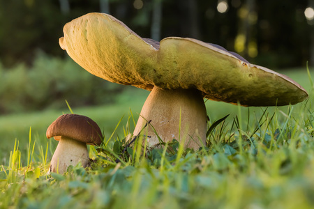 Beautiful edible mushrooms boletus with brown cap in grass in sunny woodland. Boletus edulis. Two Porcini mushrooms growing in autumn woods. Tasty delicious fungi