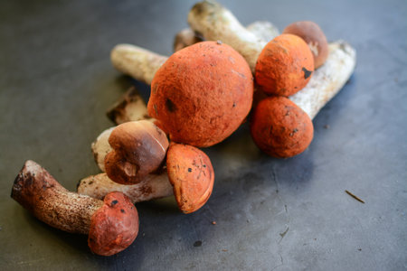 Freshly picked forest mushrooms ( Leccinum aurantiacum variety ) on white boards desk, ready to be cleaned, shallow depth of field photo, only stem in focus