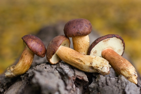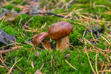 Edible Bolete Fungi Mushrooms in autumn forest.