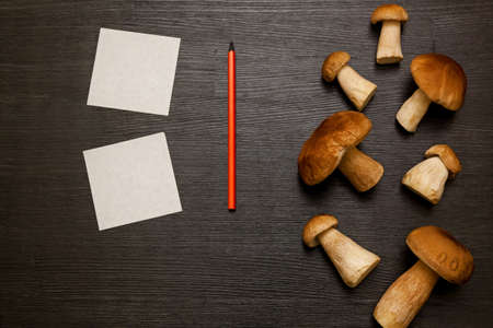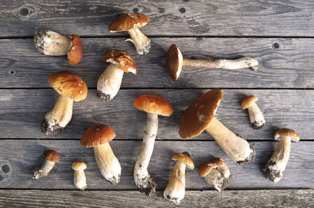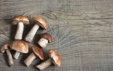 White forest mushrooms on a wooden background. Mushrooms on a wooden background with a place for an inscription. Fresh mushrooms on the table