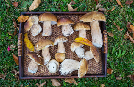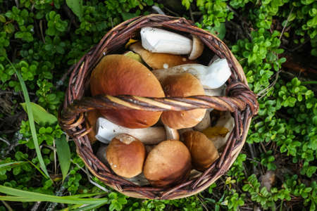 Round wicker basket with fresh porcini mushrooms in the autumn forest