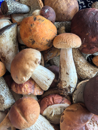 abundant natural porcini mushrooms in earthy brown and white representing a fresh forest harvest, full frame. High quality photo