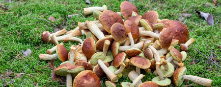 Beautiful mushrooms boletus on grass in sunny autumn woodland, top view. Boletus edulis family. Gathering porcini mushrooms in fall woods. Picking tasty delicious edible fungi