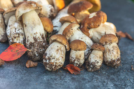 Boletus edulis, cepe, porcini mushrooms unwashed on gray concrete background, tasty food from forest, autumn menu